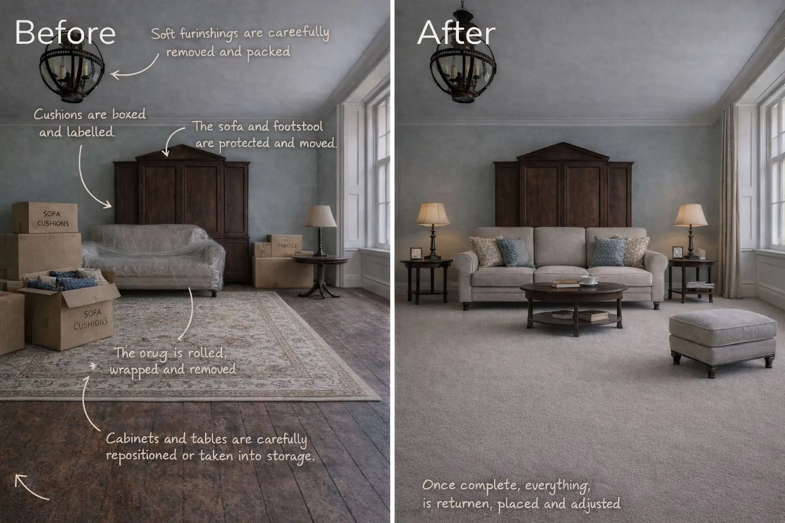 Imagine a layered living room with a large sofa, footstool, side tables, lamps, artwork and a substantial cabinet. To replace a rug with fitted carpet, interior logistics would unfold quietly and methodically: